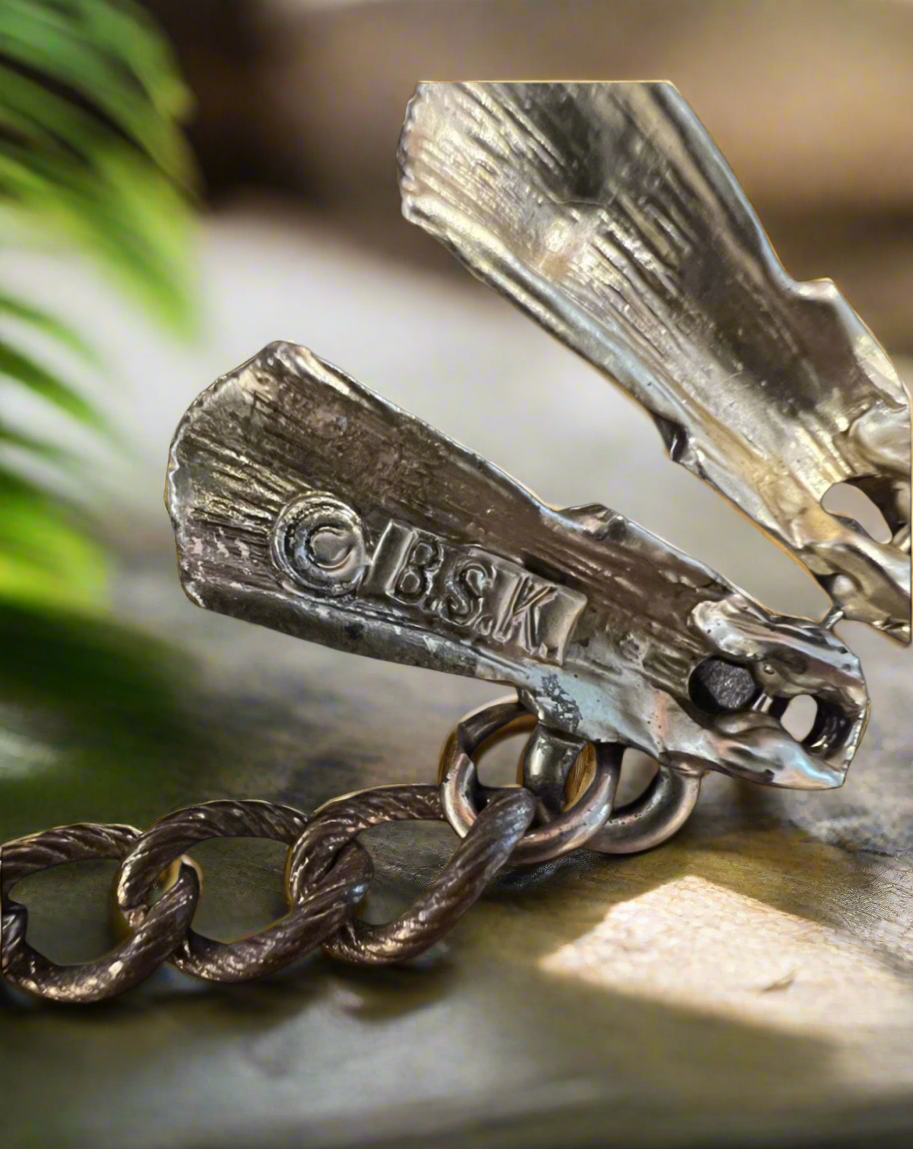 B.S.K. was renowned for creating dramatic, statement costume jewellery pieces from the 1940s through 1970s. This Egyptian revival set is likely from the 1960s-1970s, during the height of the Egyptian revival movement sparked by archaeological discoveries and Hollywood films. The intricate chain work and theatrical styling are characteristic of BSK's later period when they perfected their dramatic costume jewellery techniques.