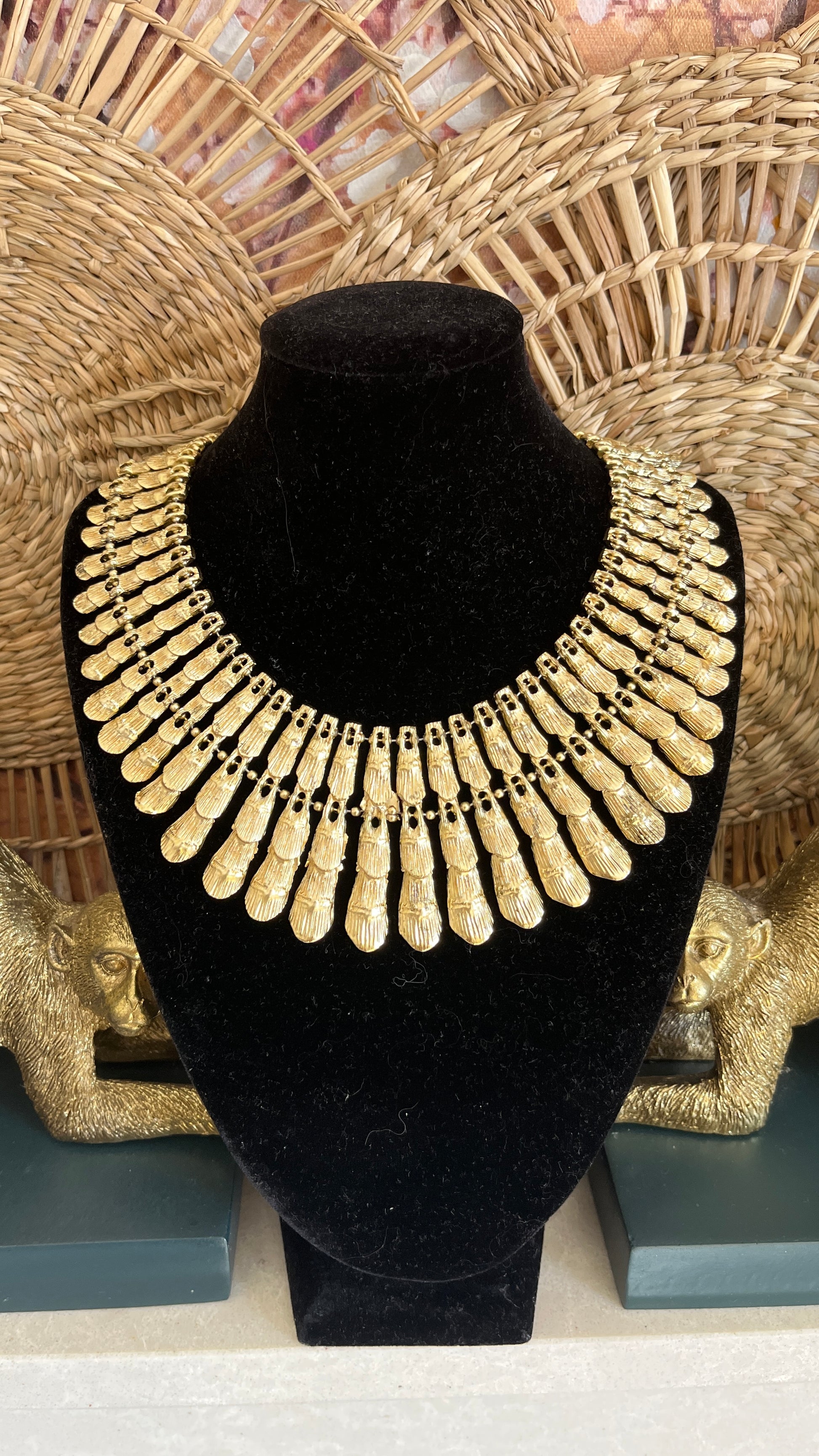 - BSK Cleopatra Scarab Necklace: Dramatic bib-style collar with multiple chain strands and scarab wing detailing