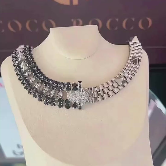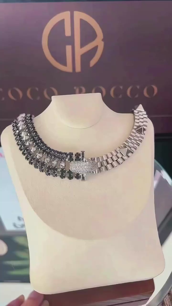 • Thick black crystal collar creating dramatic, edgy sophistication