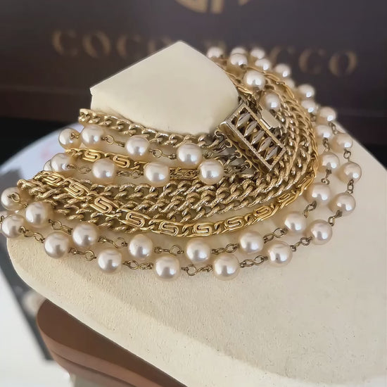 This remarkable necklace captures the essence of 1950s Italian design innovation, when jewellers like Fratti were revolutionising traditional techniques. The multi-strand construction creates a beautiful cascading effect, while the combination of pearls and gold metal demonstrates the sophisticated colour palette that defined the era.