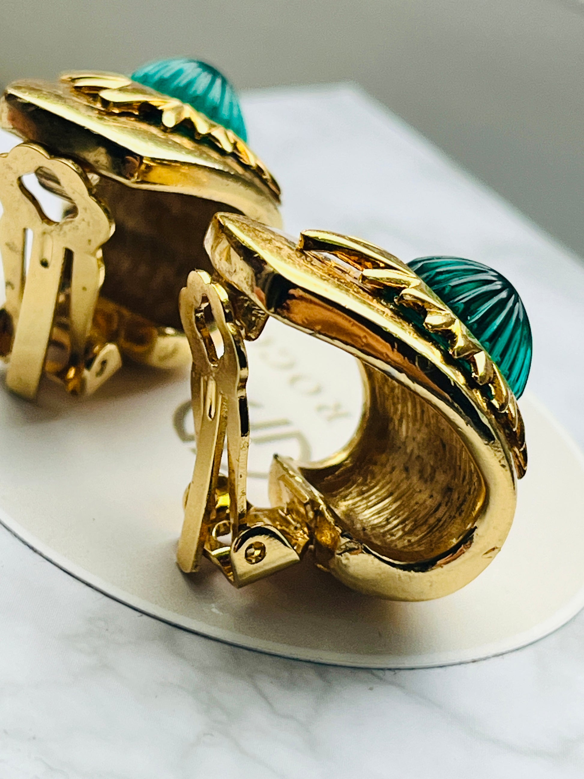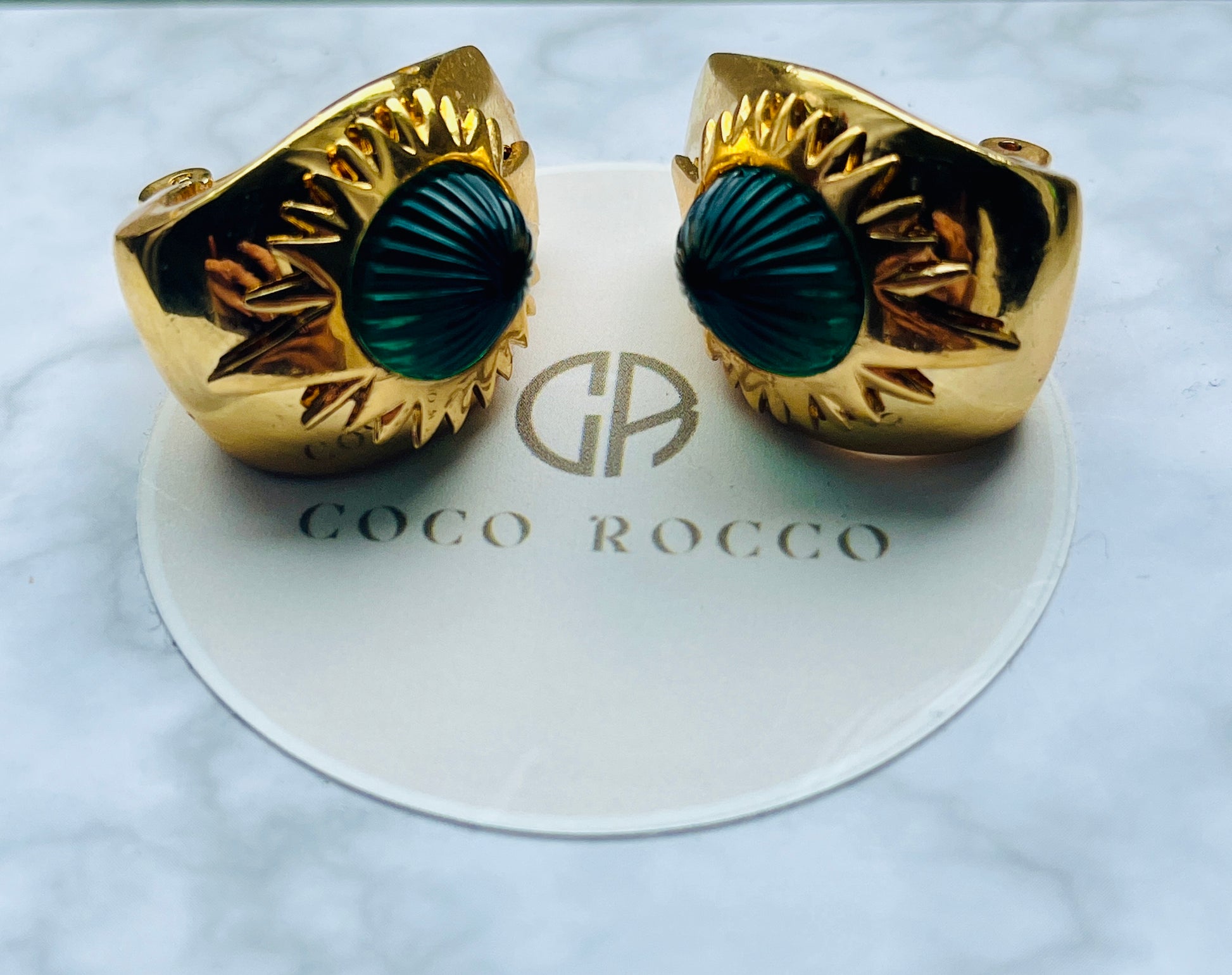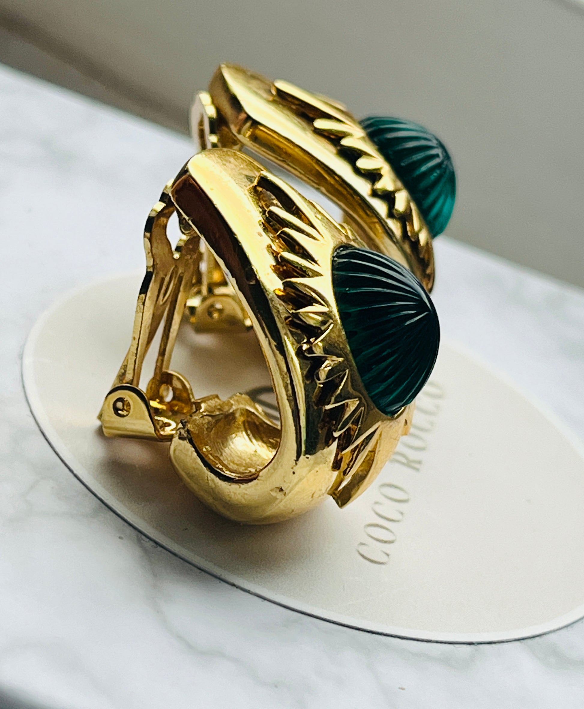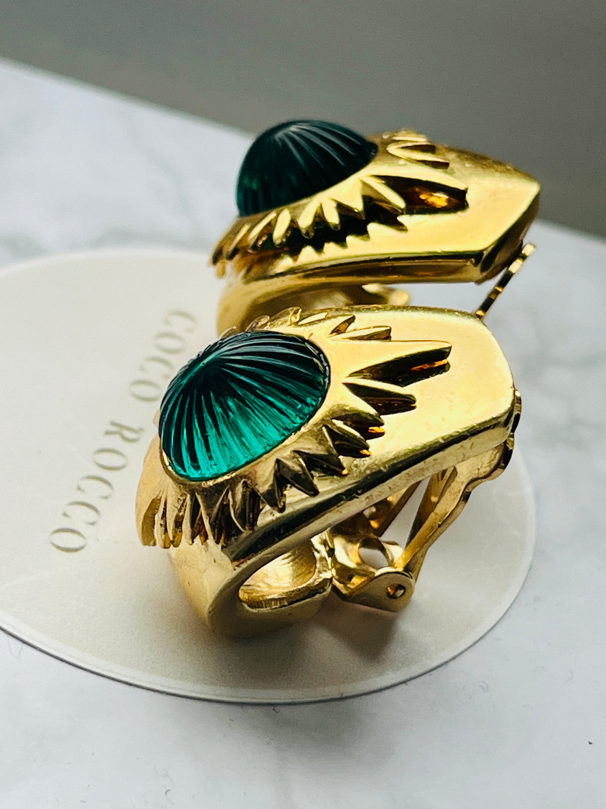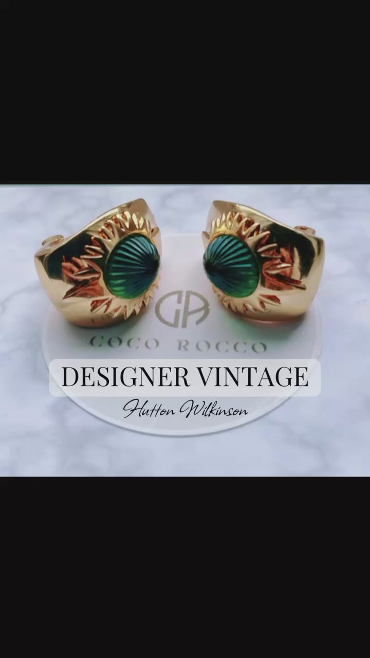 Hutton Wilkinson brought his interior designer's eye for proportion, color, and light to jewelry creation. These earrings showcase his understanding of how light interacts with materials - the engraved glass cabochons create a mesmerizing play of emerald reflections.