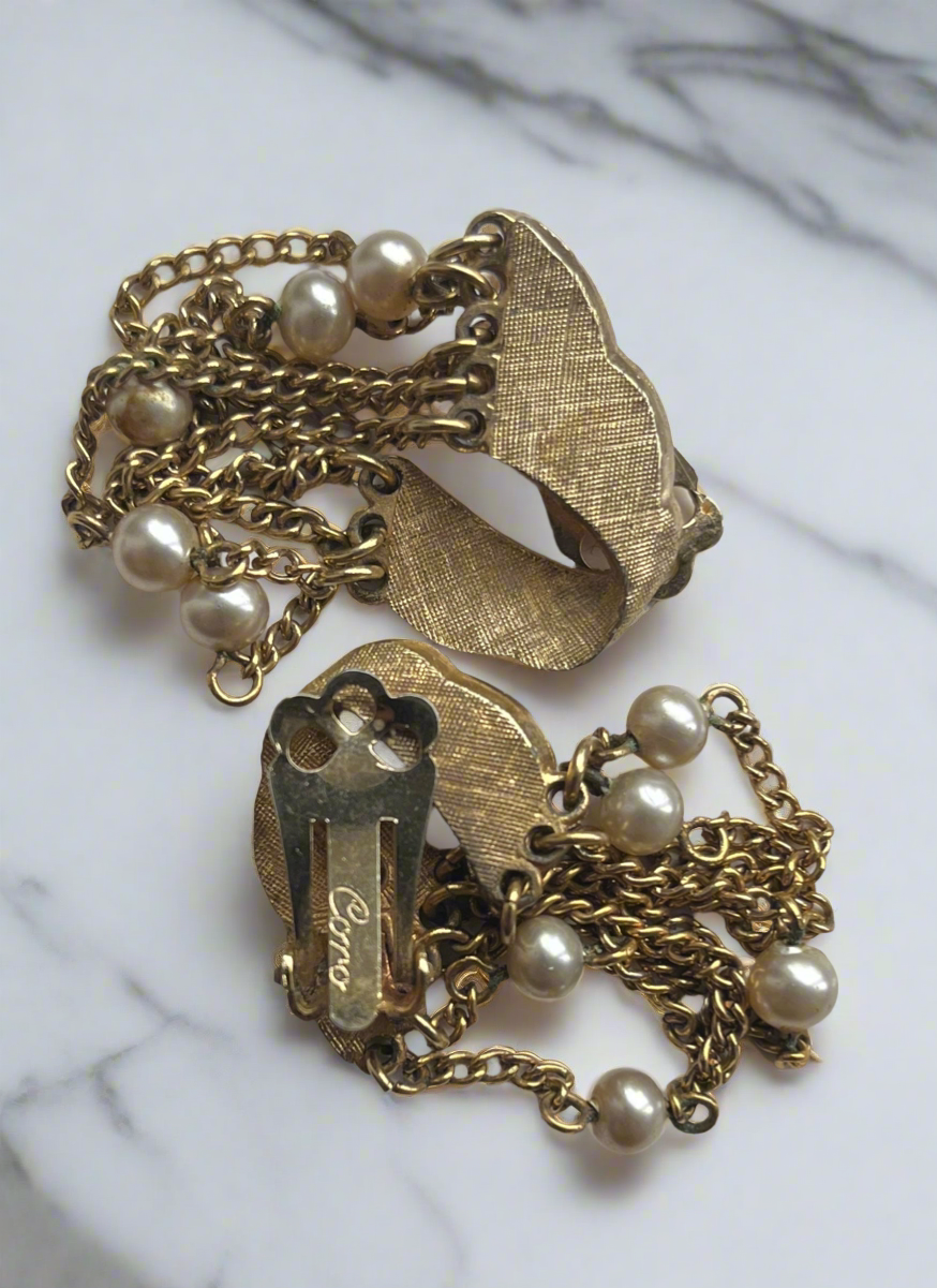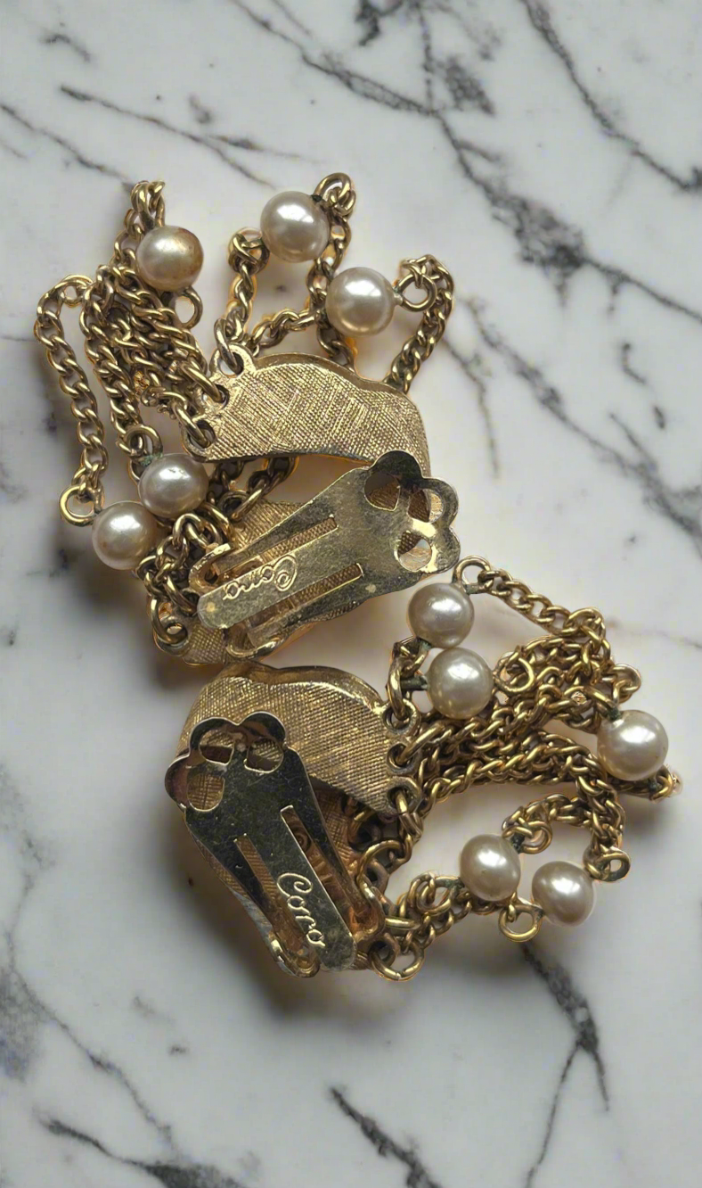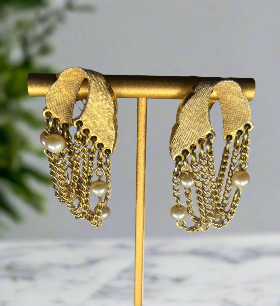 Looking for an Chanel alternative but without the price tag? Elevate your style with these one-of-a-kind 1940s Coro Pearl and Chainmail Earrings. The distressed gold tone metal paired with swinging chainmail and pearl accents exudes a sense of exclusive elegance. The perfect addition to any sophisticated outfit.