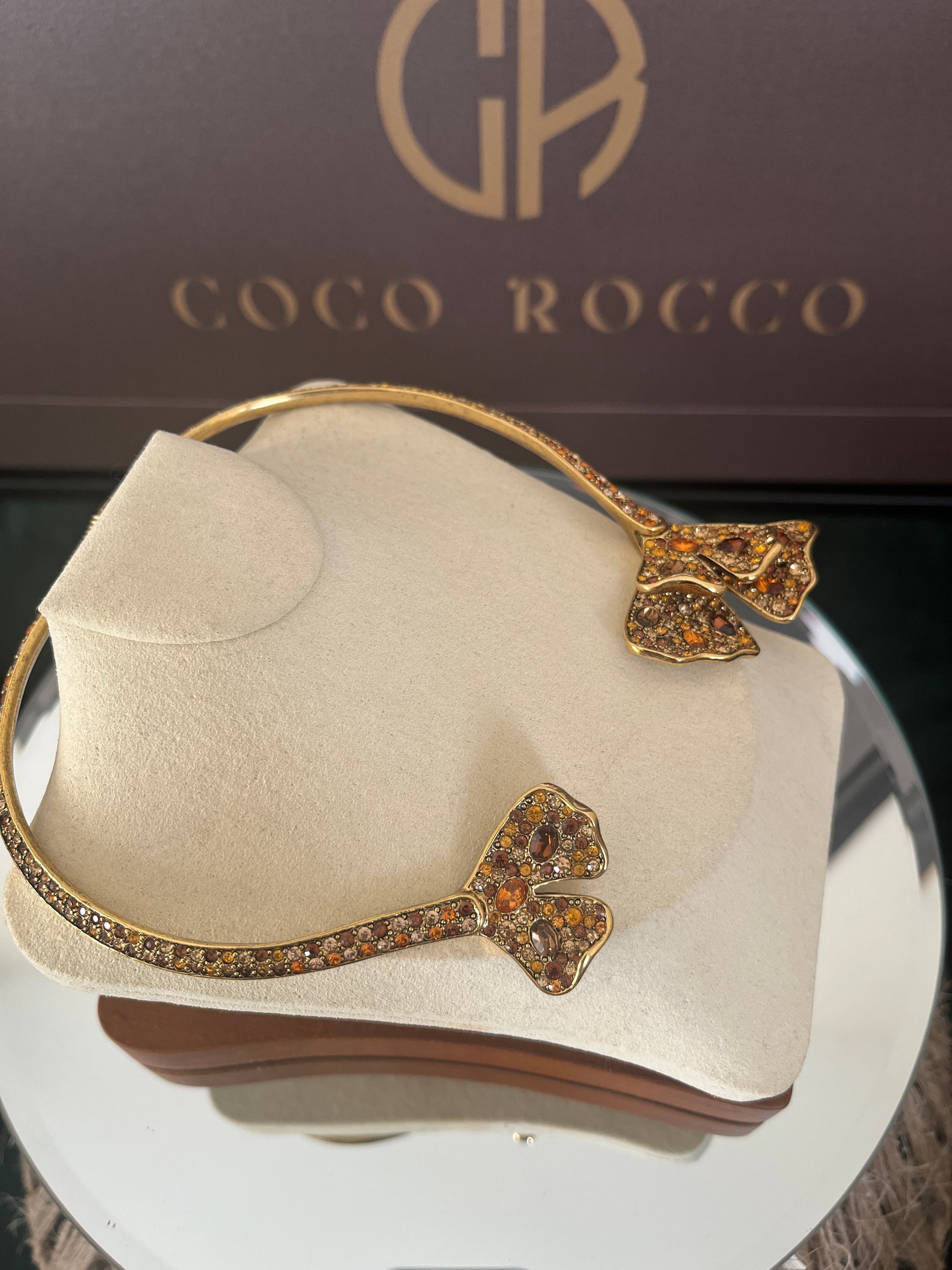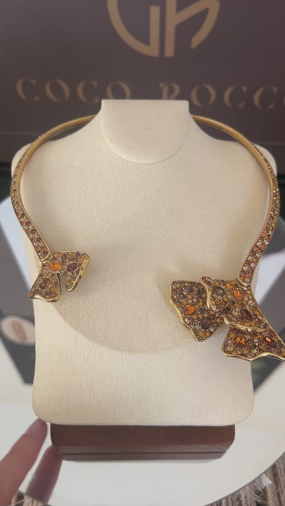 A breathtaking statement piece featuring beautifully sculpted ginkgo leaves in lustrous gold plating, fully encrusted with sparkling topaz and smokey quartz crystals. This sophisticated collar sits elegantly around the neckline, creating an instant focal point for any ensemble.